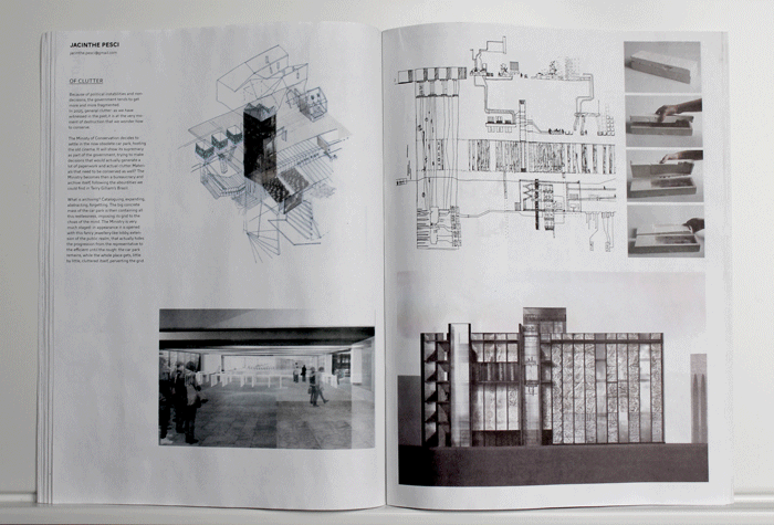 Édition des projets de diplôme de la promotion participant à l’exposition (40 personnes) dans un catalogue. Nous avons choisi le support économique du journal, pour dédramatiser l’objet, et permettre un format plus généreux. Les projets sont classés par les tendances de scénario (culturel, politique, économique, environnemental, social).