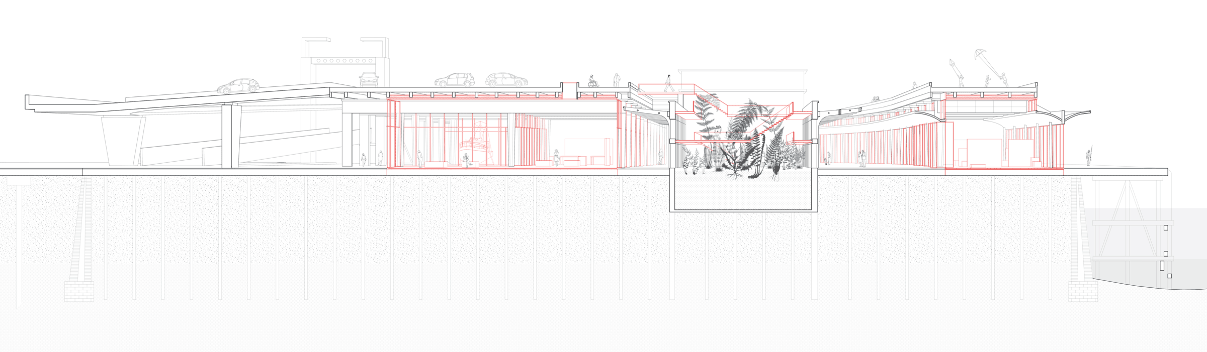 Bigness — Le patrimoine de la gare maritime est avant tout activité, un programme qu'elle a perdu. Un système distributif par la plateforme permettrait une densifacation et une juxtaposition de programmes sous la dalle.